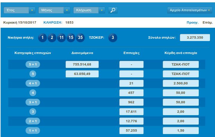 Οχι μόνο δεν βρέθηκε τυχερός που να προέβλεψε σωστά τους 5 αριθμούς και τον τζόκερ, αλλά δεν υπήρξε σωστή πρόβλεψη ούτε στην δεύτερη κατηγορία.
